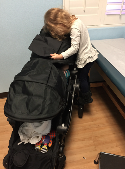 We actually made it to our appointment ON TIME; which never happens. I signed in, then after an hour of waiting in a room full of kids that sounded worse than Darth Vadar the receptionist asked me if I signed in...um what?! Yeah, an hour ago!! Apparently she threw away my sign in sticker and didn't recognize my kids because of how big they had gotten. Anyways, we finally got back into the room where we waited some more and in case you're wondering what it's like being at the doctors with 2 babies and a toddler by yourself, here ya go: