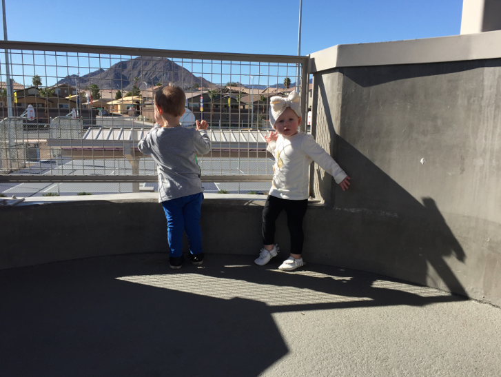 After dinner we headed to the Downtown Container Park so I could pick up my very first race packet for Saturday morning's Color Run. While finding a parking spot we spotted the coolest street art and Ed snapped some pics of the kids and I before heading to pick up my race packet: